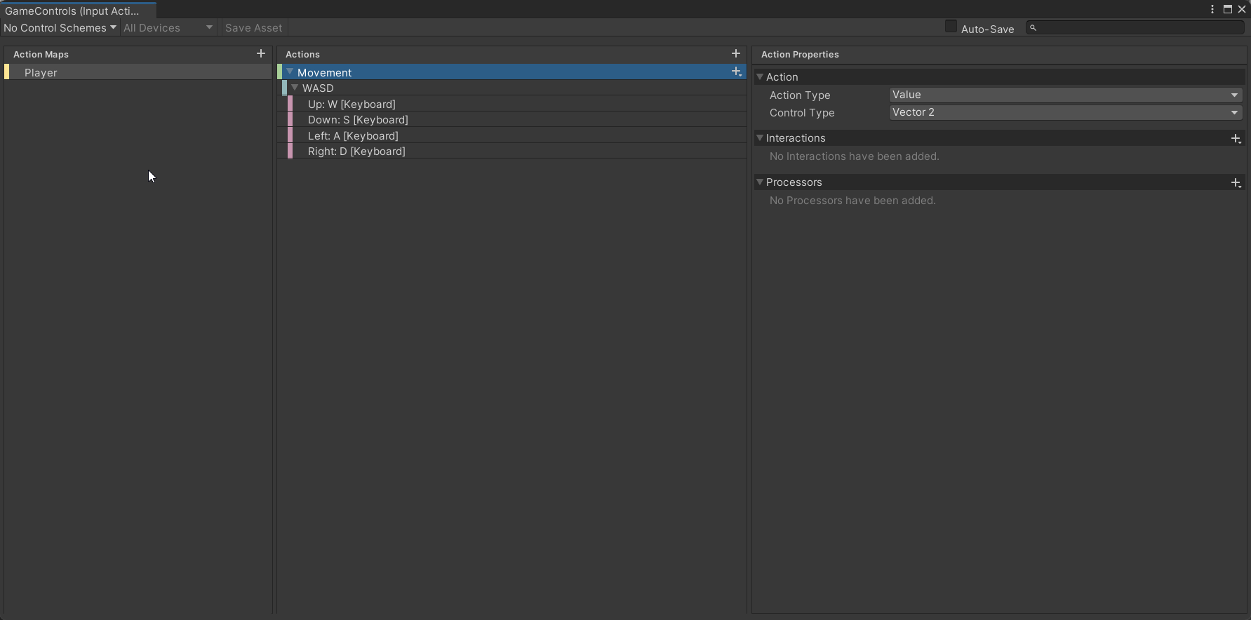 For this project we are using the new Input System. I created a Input asset, called it “GameControls”. Double click to open it and create a binding like in this picture.