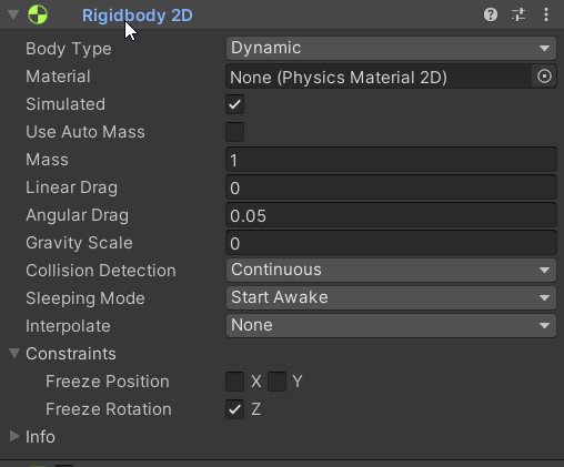 Make sure that your Rigidbody2D is set to Dynamic, has a 0 as a gravity scale and can’t be rotated on the z axis: