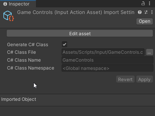 Save the asset and close this window. Then, with the new asset selected, go to the Inspector and check the “ Generate C# Class” and the Apply.