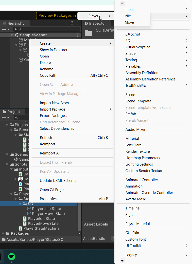 After writing this scripts, go back to the Editor and now you are able to create an Idle and Movement Scriptable Object for the player. You can have a Walk scriptable object and a Run scriptable object for example, with different speed values.
